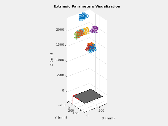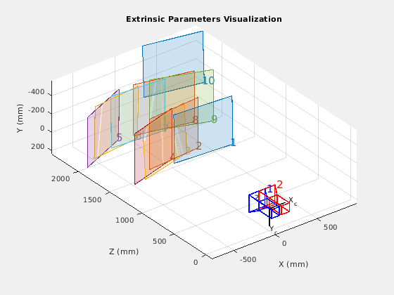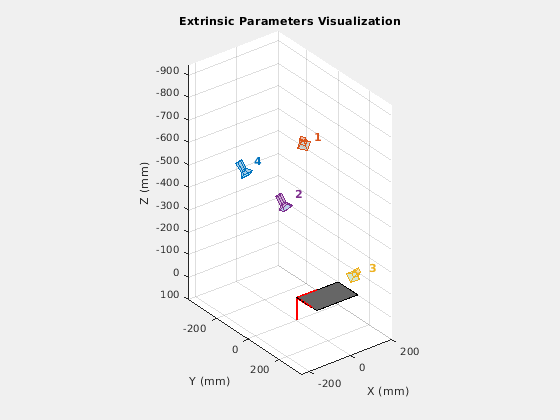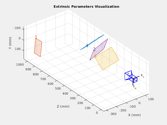showExtrinsics( представляет 3-D визуализацию внешних параметров одной калиброванной камеры или калиброванной стереопары. Графики функций 3-D представление калибровочных шаблонов относительно камеры. cameraParams)cameraParams введите содержит любого cameraParameters, fisheyeParameters, или stereoParameters объект, который estimateCameraParameters или estimateFisheyeParameters функция возвращается.