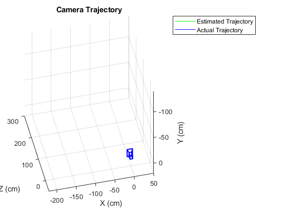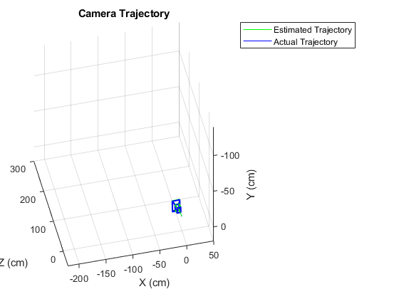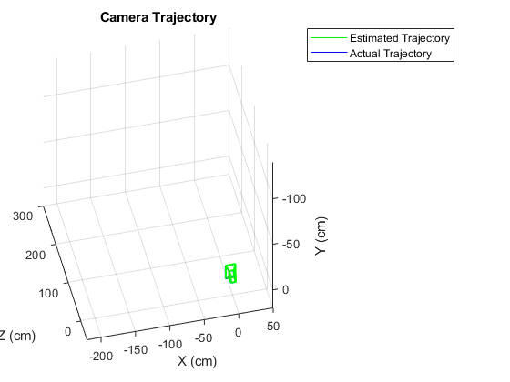 % Setup axes. figure axis([-220, 50, -140, 20, -50, 300]); % Set Y-axis to be vertical pointing down. view(gca, 3); set(gca, 'CameraUpVector', [0, -1, 0]); camorbit(gca, -120, 0, 'data', [0, 1, 0]); grid on xlabel('X (cm)'); ylabel('Y (cm)'); zlabel('Z (cm)'); hold on % Plot estimated camera pose. cameraSize = 7; camEstimated = plotCamera('Size', cameraSize, 'Location',... vSet.Views.Location{1}, 'Orientation', vSet.Views.Orientation{1},... 'Color', 'g', 'Opacity', 0); % Plot actual camera pose. camActual = plotCamera('Size', cameraSize, 'Location', ... groundTruthPoses.Location{1}, 'Orientation', ... groundTruthPoses.Orientation{1}, 'Color', 'b', 'Opacity', 0); % Initialize camera trajectories. trajectoryEstimated = plot3(0, 0, 0, 'g-'); trajectoryActual = plot3(0, 0, 0, 'b-'); legend('Estimated Trajectory', 'Actual Trajectory'); title('Camera Trajectory');