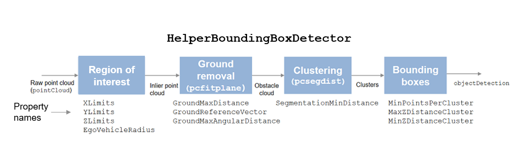 Ограничительная рамка является подходящей на каждый кластер при помощи минимума и максимума координат точек в каждой размерности. Детектор реализован классом поддержки HelperBoundingBoxDetector, который переносит сегментацию облака точек и кластеризирующиеся функциональности. Объект этого класса принимает pointCloud введите и возвращает список objectDetection объекты с измерениями ограничительной рамки.