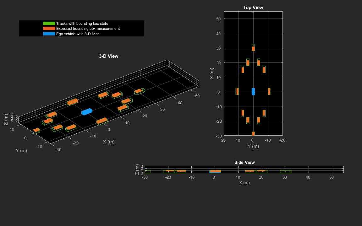 Заметьте, что количество подтвержденных дорожек является тем же самым для выполнения кода MEX и MATLAB. Это гарантирует, что лидар предварительно обрабатывающий и отслеживающий алгоритм возвращает те же результаты со сгенерированным кодом C как с кодом MATLAB.