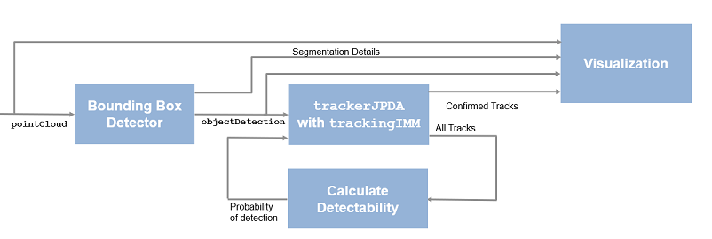 Функция вычисляет вероятность обнаружения для каждой дорожки. Эта функция используется, чтобы сгенерировать вход "DetectableTracksIDs" для trackerJPDA.