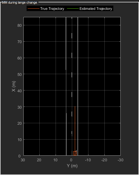 Фильтр IMM обновляет вероятность каждой модели, когда это корректируется обнаружениями от объекта. Анимация ниже показов предполагаемая траектория транспортного средства во время маршрута изменяет событие и соответствующие предполагаемые вероятности каждой модели.