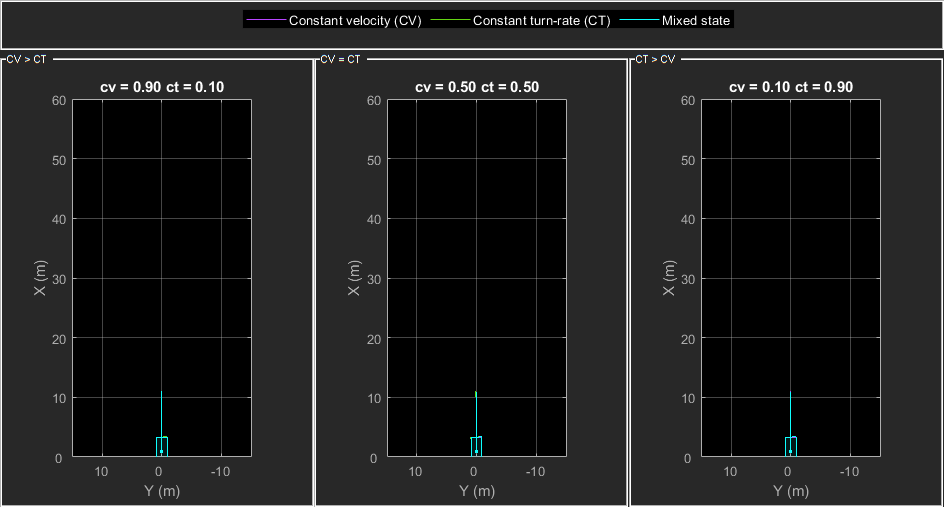 Объединенное вероятностное средство отслеживания ассоциации данных (trackerJPDA) вместе с фильтром IMM (trackingIMM) используется к отслеживаемым объектам в этом примере. Фильтр IMM использует постоянную скорость и постоянную модель угловой скорости вращения и инициализируется с помощью функции поддержки, helperInitIMMFilter, включенный с этим примером. Подход IMM помогает дорожке переключиться между моделями движения и таким образом достигнуть хорошей точности оценки во время событий как изменение маршрута или маневрирование. Анимация ниже показов эффект смешивания постоянной скорости и постоянной модели угловой скорости вращения во время этапов прогноза фильтра IMM.
