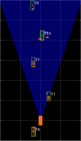 Анимация выше показов симуляция между временем = 3 секунды и временем = 16 секунд. Заметьте, что дорожки, такие как T9 и T6 обеспечивают свои идентификаторы и траекторию во время отрезка времени. Однако отследите T10, потерян, потому что гусеничная машина ушлась (не обнаруженный) в течение долгого времени датчиком. Кроме того, заметьте, что отслеживаемые объекты могут обеспечить свою форму и кинематический центр путем расположения обнаружений на видимые фрагменты транспортных средств. Например, как Дорожка T7 продвигается, обнаружения ограничительной рамки начинают падать на ее видимый задний фрагмент, и дорожка обеспечивает фактический размер транспортного средства. Это иллюстрирует эффект смещения и уменьшения, смоделированный в функциях измерения.