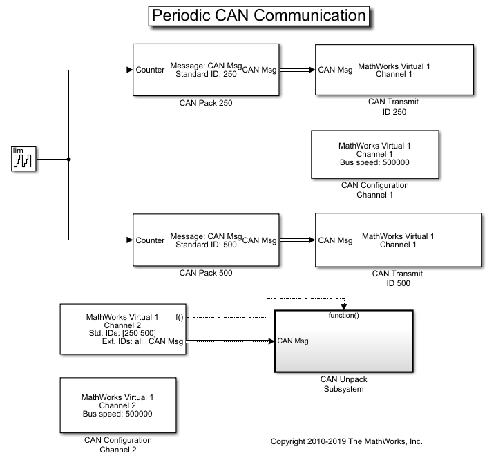 Этот пример использует MathWorks Virtual CAN channels, чтобы настроить периодическую передачу и прием сообщений CAN, с помощью Simulink®. Виртуальные каналы соединяются в петлевой настройке.