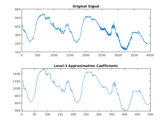 Извлеките коэффициенты приближения уровня 3. Постройте исходный сигнал и коэффициенты приближения.