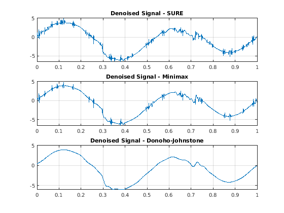 Минимакс и пороговые правила выбора SURE более консервативны и более удобны, когда маленькие детали функционального f находятся в шумовом диапазоне. Два других правила удаляют шум более эффективно. Опция 'heursure' компромисс.