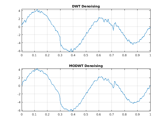 возвращает denoised версию XD = wden(X,TPTR,SORH,SCAL,N,wname)XD из X сигнала. Функция использует N- разложение вейвлета уровня X использование заданного ортогонального или биоортогонального вейвлета wname получить коэффициенты вейвлета. Выбор пороговой обработки управляет TPTR применяется к разложению вейвлета. SORH и SCAL задайте, как правило применяется.