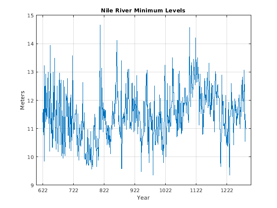 load nileriverminima years = 622:1284; figure plot(years,nileriverminima) title('Nile River Minimum Levels') AX = gca; AX.XTick = 622:100:1222; grid on xlabel('Year') ylabel('Meters')