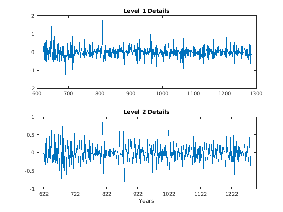figure subplot(2,1,1) plot(years,mra(1,:)) title('Level 1 Details') subplot(2,1,2) plot(years,mra(2,:)) title('Level 2 Details') AX = gca; AX.XTick = 622:100:1222; xlabel('Years')