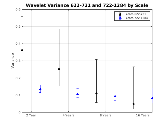 Vpre = table2array(wvarpre); Vpost = table2array(wvarpost); Vpre = Vpre(1:end-1,2:end); Vpost = Vpost(1:end-1,2:end); Vpre(:,1) = Vpre(:,2)-Vpre(:,1); Vpre(:,3) = Vpre(:,3)-Vpre(:,2); Vpost(:,1) = Vpost(:,2)-Vpost(:,1); Vpost(:,3) = Vpost(:,3)-Vpost(:,2); figure errorbar(1:4,Vpre(:,2),Vpre(:,1),Vpre(:,3),'ko',... 'MarkerFaceColor',[0 0 0]) hold on errorbar(1.5:4.5,Vpost(:,2),Vpost(:,1),Vpost(:,3),'b^',... 'MarkerFaceColor',[0 0 1]) set(gca,'xtick',1.25:4.25) set(gca,'xticklabel',{'2 Year','4 Years','8 Years','16 Years','32 Years'}) grid on ylabel('Variance') title('Wavelet Variance 622-721 and 722-1284 by Scale','fontsize',14) legend('Years 622-721','Years 722-1284','Location','NorthEast')