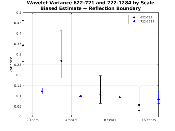 Vpre = table2array(wvarpre); Vpost = table2array(wvarpost); Vpre = Vpre(1:end-1,2:end); Vpost = Vpost(1:end-1,2:end); Vpre(:,1) = Vpre(:,2)-Vpre(:,1); Vpre(:,3) = Vpre(:,3)-Vpre(:,2); Vpost(:,1) = Vpost(:,2)-Vpost(:,1); Vpost(:,3) = Vpost(:,3)-Vpost(:,2); figure errorbar(1:4,Vpre(:,2),Vpre(:,1),Vpre(:,3),'ko','MarkerFaceColor',[0 0 0]) hold on errorbar(1.5:4.5,Vpost(:,2),Vpost(:,1),Vpost(:,3),'b^','MarkerFaceColor',[0 0 1]) set(gca,'xtick',1.25:4.25) set(gca,'xticklabel',{'2 Years','4 Years', '8 Years', '16 Years','32 Years'}) grid on ylabel('Variance') title({'Wavelet Variance 622-721 and 722-1284 by Scale'; ... 'Biased Estimate -- Reflection Boundary'},'fontsize',14) legend('622-721','722-1284','Location','NorthEast') hold off