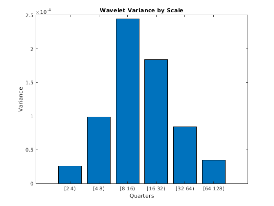 В vardata у вас есть отклонение для совокупных временных рядов GDP. В varwt у вас есть отклонение шкалой для MODWT. В varwt существует семь элементов потому что вы получили MODWT вниз, чтобы выровнять шесть получившихся в шести содействующих отклонениях вейвлета и одном содействующем отклонении масштабирования. Суммируйте отклонения шкалой, чтобы видеть, что отклонение сохраняется. Постройте отклонения вейвлета по шкале, игнорирующей масштабирующееся содействующее отклонение.