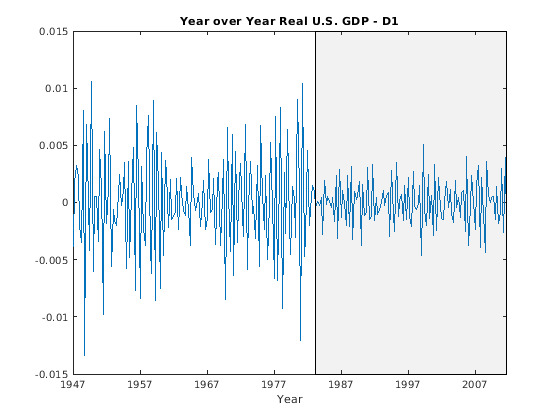 В финансовых временных рядах можно использовать вейвлеты, чтобы обнаружить изменения в энергозависимости. Чтобы проиллюстрировать это, рассмотрите ежеквартальные взвешенные цепью американские действительные данные о GDP для 1974Q1 к 2012Q4. Данные были преобразованы путем первого взятия натурального логарифма и затем вычисления различия года по году. Получите вейвлет, преобразовывают (MODWT) действительных данных о GDP вниз, чтобы выровняться шесть с 'db2' вейвлетом. Исследуйте отклонение данных и сравните это с отклонениями шкалой, полученной с MODWT.