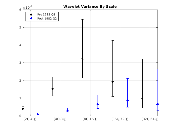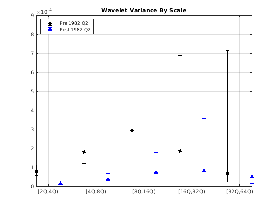 wtpre = modwt(tspre,'db2',5,'reflection'); wtpost = modwt(tspost,'db2',5,'reflection'); prevar = modwtvar(wtpre,'db2',0.95,'EstimatorType','biased','table'); postvar = modwtvar(wtpost,'db2',0.95,'EstimatorType','biased','table'); xlab = {'[2Q,4Q)','[4Q,8Q)','[8Q,16Q)','[16Q,32Q)','[32Q,64Q)'}; figure helperFinancialDataExampleVariancePlot(prevar,postvar,'table',xlab) title('Wavelet Variance By Scale') legend('Pre 1982 Q2','Post 1982 Q2','Location','NorthWest')