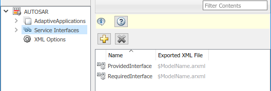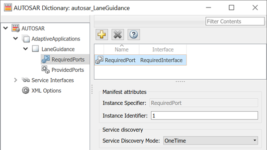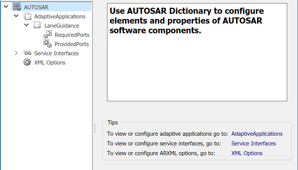 Чтобы сконфигурировать сервисные элементы интерфейса AUTOSAR и свойства, откройте модель, для которой сопоставленный адаптивный компонент программного обеспечения AUTOSAR был создан и открывает Словарь AUTOSAR.