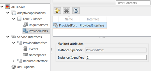 Чтобы сконфигурировать адаптивную сервисную идентификацию экземпляра для порта, выберите порт и просмотрите его Manifest attributes. На основе сервисной формы экземпляра, выбранной в опциях XML, исследуйте значение на Instance Specifier или Instance Identifier. Можно ввести значение или принять существующее значение. Для получения дополнительной информации смотрите, Конфигурируют Адаптивную Сервисную Идентификацию Экземпляра AUTOSAR.