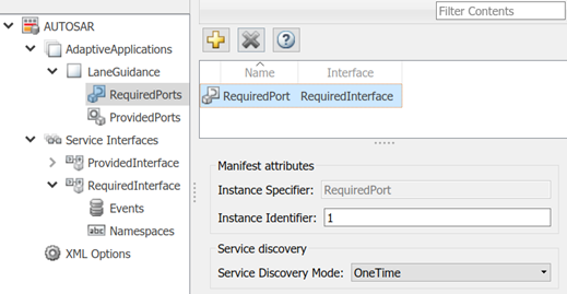 Чтобы сконфигурировать адаптивное сервисное поведение открытия для требуемого порта, выберите порт и просмотрите его Service Discovery Mode. Можно выбрать режим OneTime или DynamicDiscovery. Для получения дополнительной информации смотрите, Конфигурируют Адаптивные Сервисные Режимы Открытия AUTOSAR.