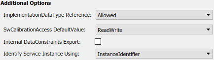 В качестве альтернативы можно программно сконфигурировать дополнительные опции XML путем вызова set AUTOSAR функция. Задайте имя свойства и значение. Допустимыми именами свойства является ImplementationTypeReference, SwCalibrationAccessDefault, InternalDataConstraintExport, и IdentifyServiceInstance. Например:
