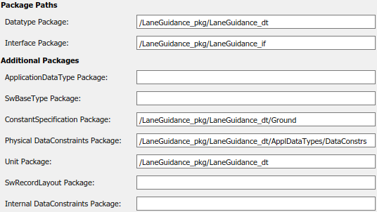 Смотрите и измените пути к пакету AUTOSAR, сгруппированные в соответствии с заголовками Package Paths и Additional Packages.