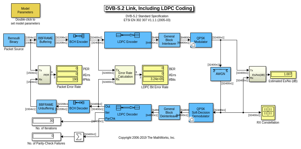 Этот пример моделирует энкодер BCH, энкодер LDPC, interleaver, модулятор, а также их дубликаты в получателе, согласно стандарту DVB-S.2.