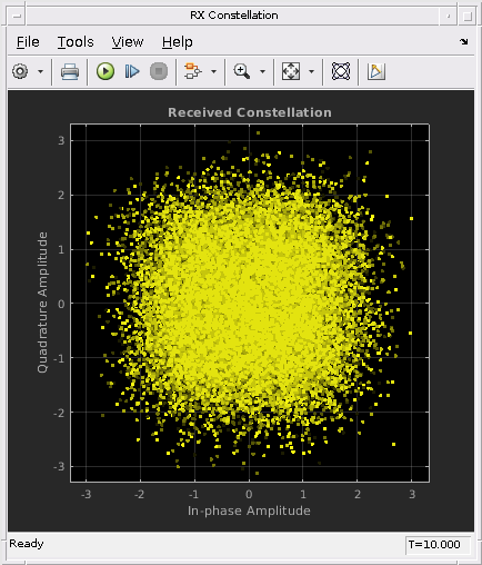 Когда модель запускается, окно автоматически подходит, чтобы отобразить график рассеивания полученного сигнала. Частота ошибок по битам LDPC, пакетный коэффициент ошибок и оцененный Es/No от полученного сигнала будут постоянно обновляться.