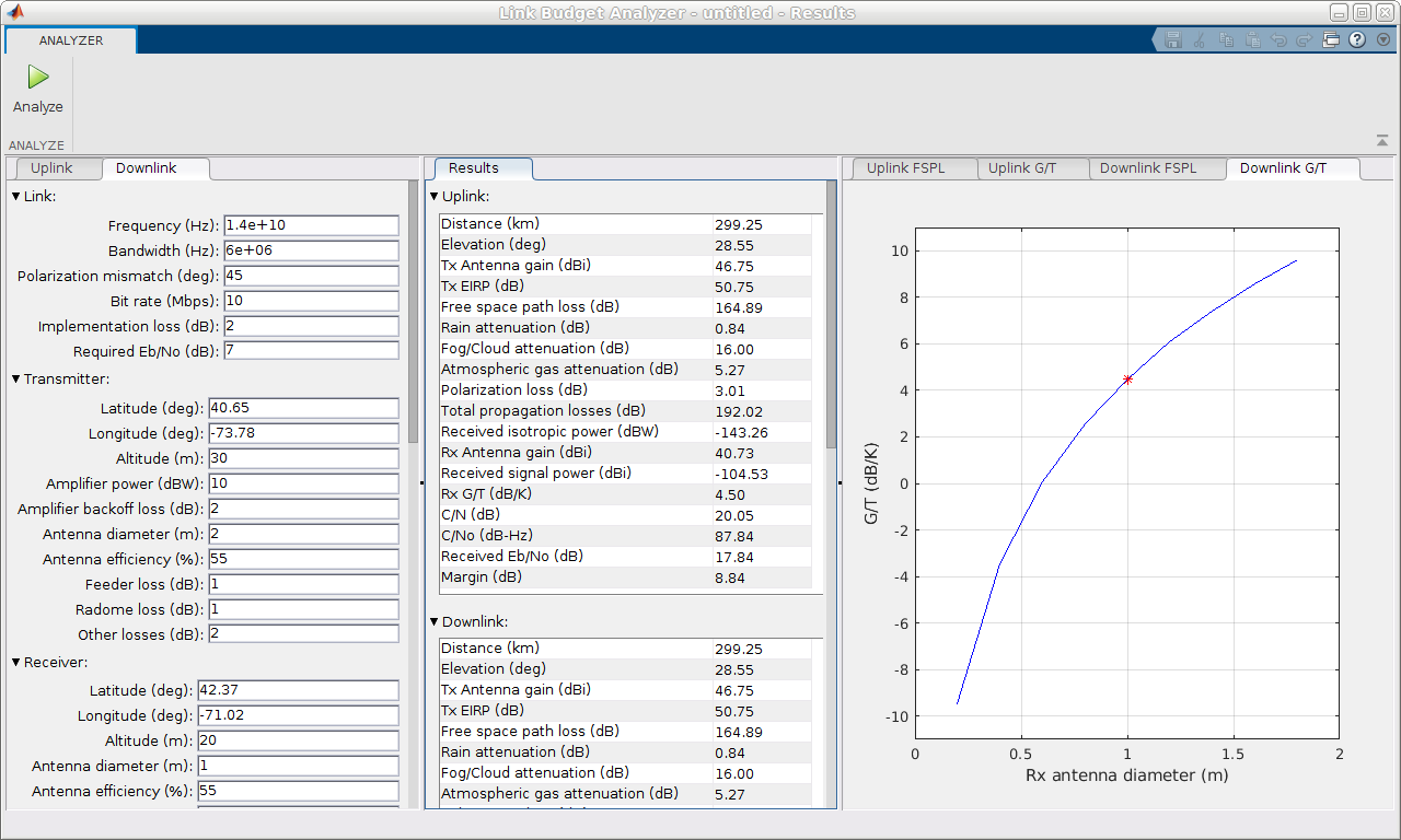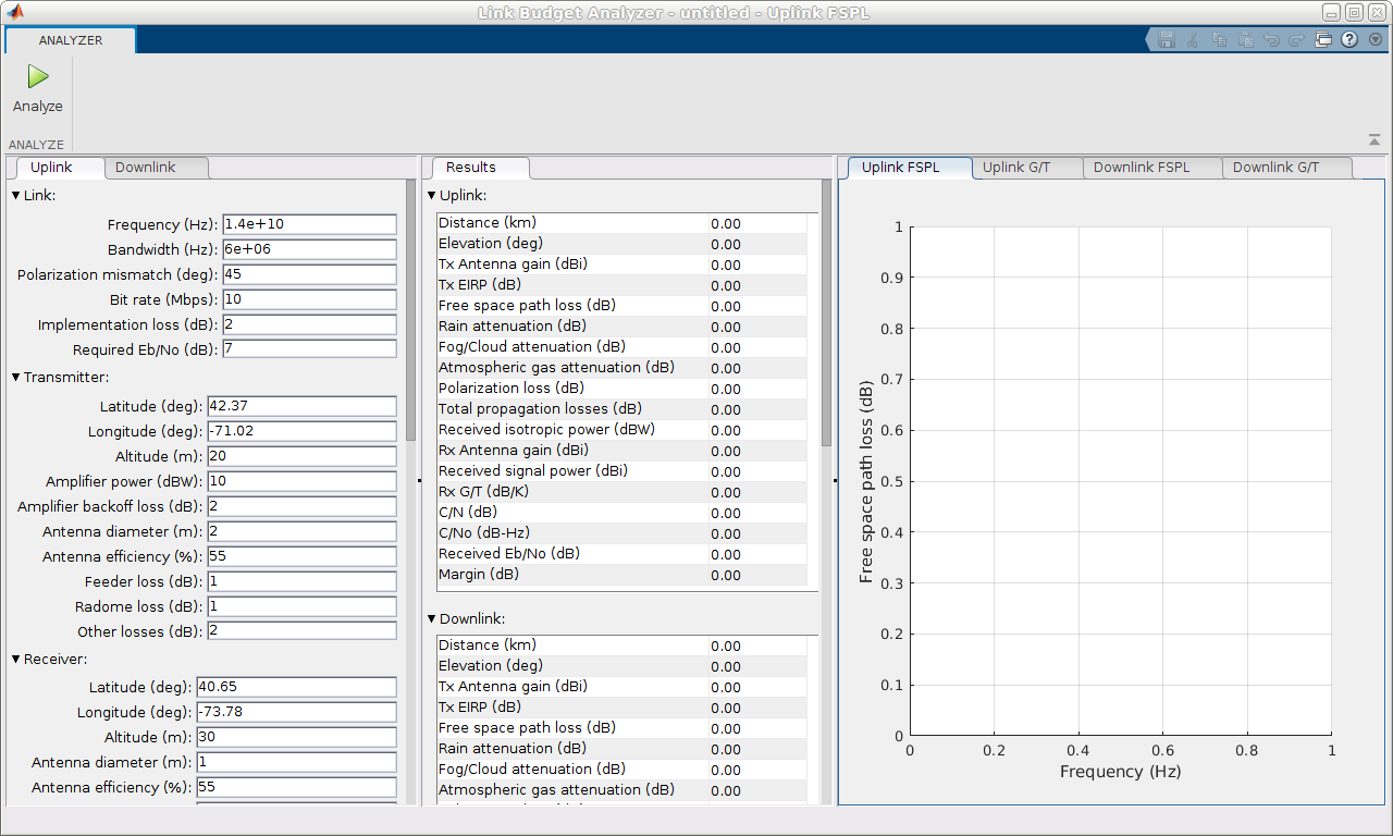 Этот пример использует linkBudgetAnalyzer приложение, чтобы свести в таблицу системные параметры и вычислить прибыли и убытки та производительность системы удара. Отдельные вкладки задают настройки для Восходящего канала и Нисходящего канала. После определения восходящих и нисходящих настроек выберите Analyze, чтобы обновить прибыли и убытки, о которых сообщают во вкладке Results и вкладках с графиками потерь при распространении в свободном пространстве (FSPL) и G/T для восходящего канала и нисходящего канала.