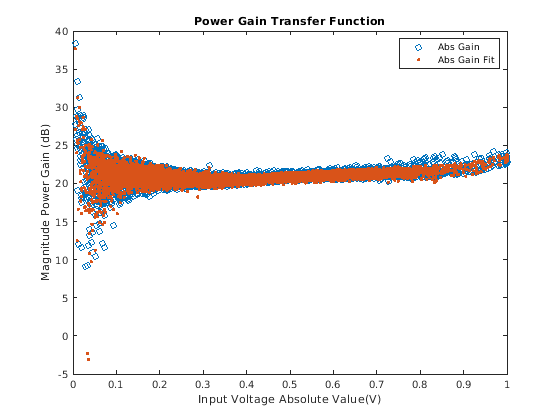 TransferPA_fit = abs(outDataPA_fit./inDataPA(:)); plot(abs(inDataPA), 20*log10(TransferPA), 'o', ... abs(inDataPA), 20*log10(TransferPA_fit), '.') xlabel('Input Voltage Absolute Value(V)') ylabel('Magnitude Power Gain (dB)') legend('Abs Gain','Abs Gain Fit','Location','northeast') title('Power Gain Transfer Function')