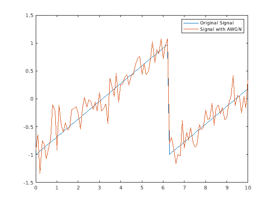 принимает значение степени входного сигнала в dBW. Чтобы иметь функцию измеряют степень out = awgn(in,snr,signalpower)in прежде, чем добавить шум, задайте signalpower как 'measured'.