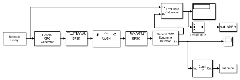 Система координат двоичного сигнала добавила код CRC в конец системы координат. Модуляция BSPK применяется к сигналу, и сигнал проходит через канал AWGN. Сигнал демодулируется, и затем детектор синдрома CRC удаляет CRC и вычисляет ошибки CRC.