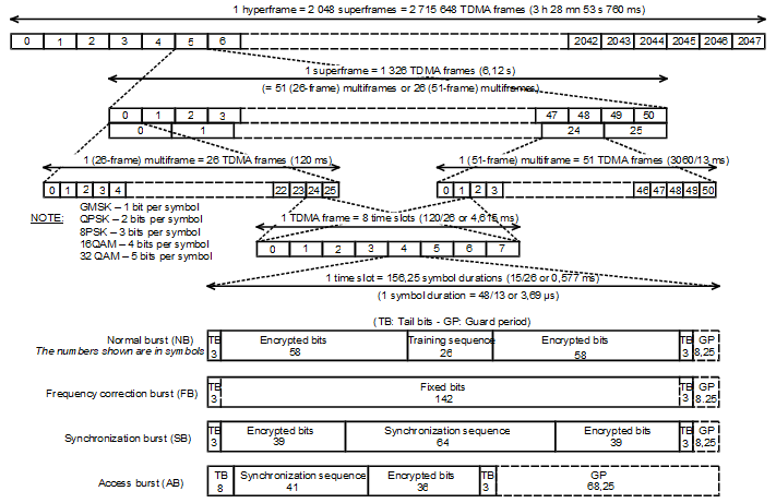 Стандарт GSM [1] задает систему координат TDMA как комбинацию 8 временных интервалов. Каждый временной интервал имеет длительность 3/5200 секунд (приблизительно 0,577 мс) и номера временного интервала (TN) от 0 до 7. GSM структурирует модуляцию GMSK использования, где один символ эквивалентен одному биту. Каждый временной интервал 156,25 битов длиной. Содержимое временного интервала называется пакетом. Синхронизация передачи пакета в течение временного интервала задана в терминах битного номера. Битный номер (BN) относится к конкретному битному периоду в течение временного интервала. Бит с самым низким битным номером передается сначала. BN0 является первым битным периодом, и BN156 является последним битным четвертью периодом. Этот рисунок показывает периоды времени, временные интервалы, и разрывается для системы GSM [1].