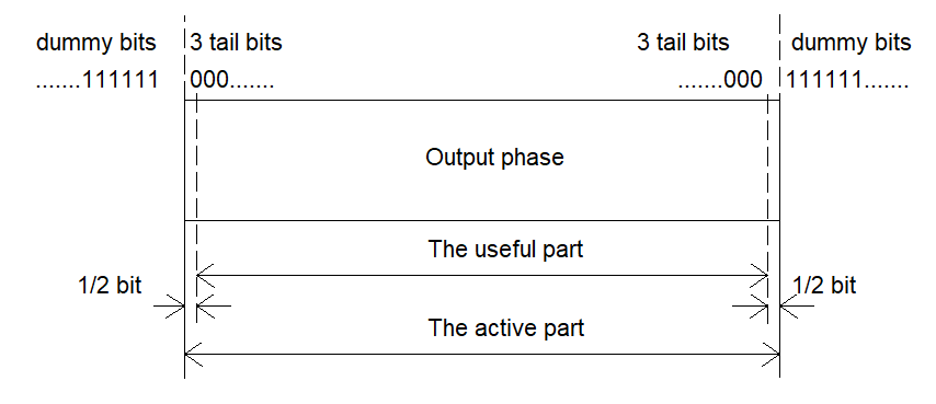 Стандарт GSM, [3], требует, чтобы мобильные станции ослабили свою передачу в период между пакетами. Наращивание и пандус вниз уровня мощности сигнала происходят в защитные периоды. Полезная часть пакета запускает половину пути через битный номер 0. Полезная часть заканчивается на полпути через BN87 для ABs и BN147 для NBS, FBs, SBs и фиктивных пакетов. Этот рисунок показывает полезные и активные части пакета.