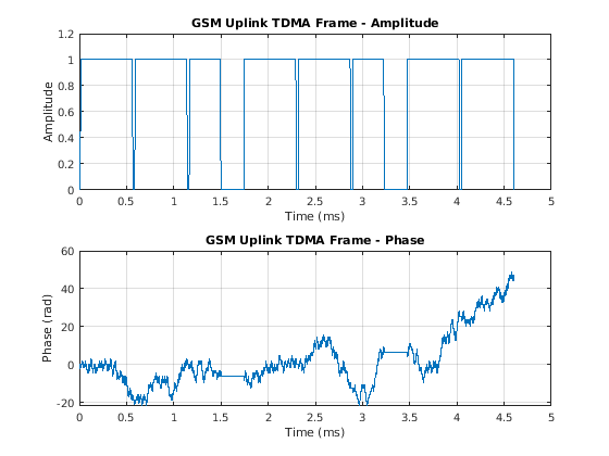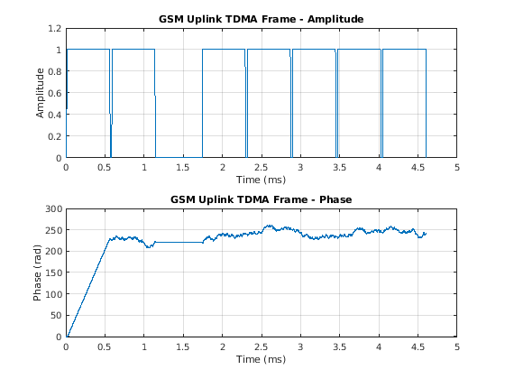 wfInfo = gsmInfo(cfg); Rs = wfInfo.SampleRate; t = (0:length(x) - 1)/Rs*1e3; subplot(2,1,1) plot(t,abs(x)) grid on axis([0 5 0 1.2]) title('GSM Uplink TDMA Frame - Amplitude') xlabel('Time (ms)');ylabel('Amplitude') subplot(2,1,2) plot(t,unwrap(angle(x))) grid on title('GSM Uplink TDMA Frame - Phase') xlabel('Time (ms)') ylabel('Phase (rad)')