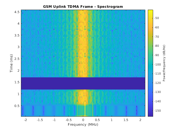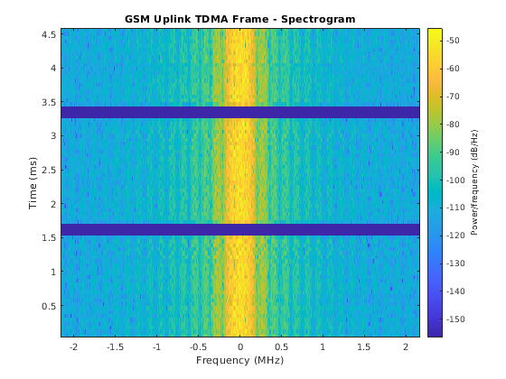 figure spectrogram(x,500,[],[],Rs,'centered') title('GSM Uplink TDMA Frame - Spectrogram')