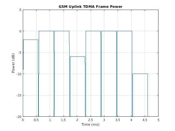 x = gsmFrame(cfg); wfInfo = gsmInfo(cfg); Rs = wfInfo.SampleRate; t = (0:length(x) - 1)/Rs*1e3; plot(t, 20*log10(abs(x))) axis([0 5 -20 5]) grid on title('GSM Uplink TDMA Frame Power') xlabel('Time (ms)') ylabel('Power (dB)')
