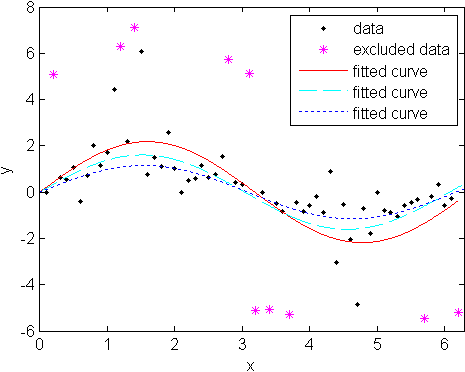 plot(fit1,'r-',xdata,ydata,'k.',outliers,'m*') hold on plot(fit2,'c--') plot(fit3,'b:') xlim([0 2*pi])