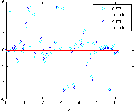 figure plot(fit2,xdata,ydata,'co','residuals') hold on plot(fit3,xdata,ydata,'bx','residuals')