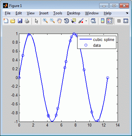 который не так хорош. Если вы предпочитаете получать interpolant чьи первые и вторые производные в этих двух конечных точках, 0 и 4*pi, совпадайте, используйте вместо этого команду csape который разрешает спецификацию многих различных видов граничных условий, включая периодические граничные условия. Так, используйте вместо этого