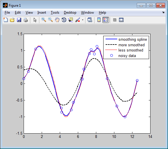 Время от времени вы можете предпочесть просто получать самый сглаженный кубический сплайн sp это - в заданном допуске tol из определенных данных в том смысле, что norm(noisy - fnval(sp,x))^2 <= tol. Вы создаете этот сплайн с командой sp = spaps(x,noisy,tol) для вашего заданного допуска tol.