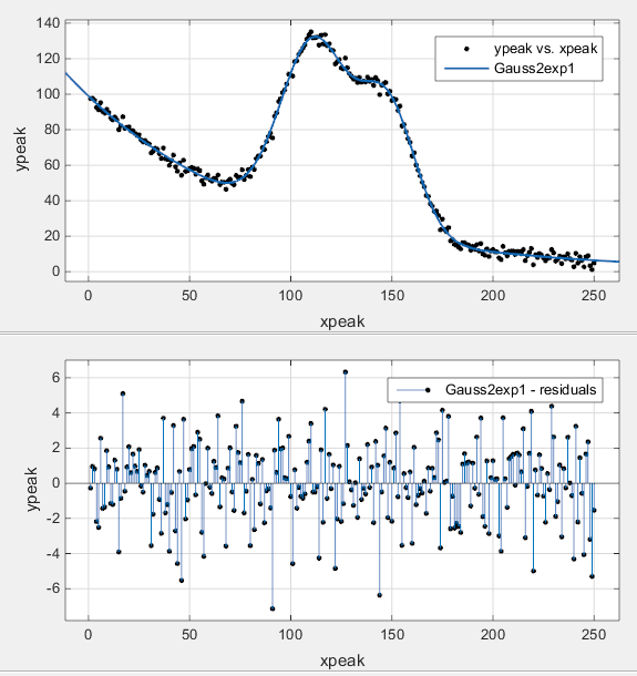 где ai является пиковыми амплитудами, bi пиковые центроиды, и ci связан с пиковыми ширинами. Поскольку неизвестные коэффициенты являются частью аргументов показательной функции, уравнение нелинейно.