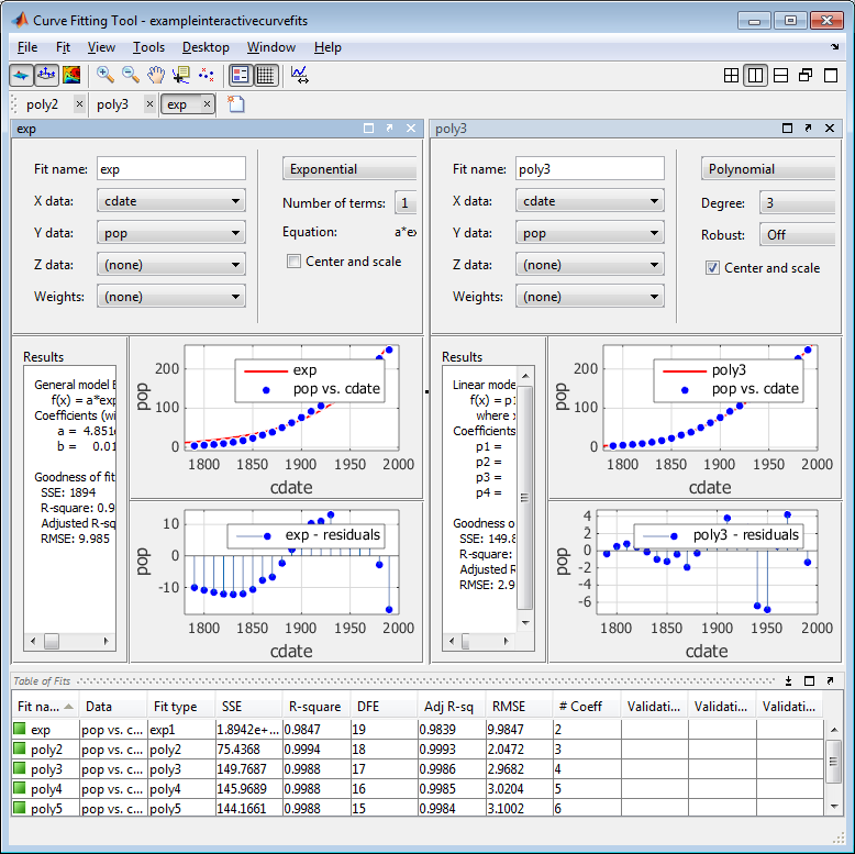 Создайте несколько подгонок, и можно сравнить различные подходящие типы и настройки рядом друг с другом в приложении Curve Fitting. Смотрите Создание Нескольких Подгонок.