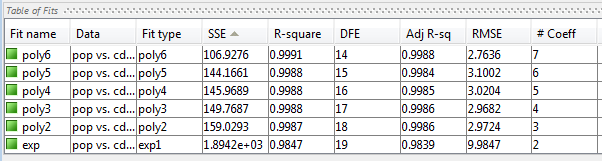Чтобы сравнить статистику для различных подгонок и решить, между которым подгонка является лучшим компромиссом сверх - и под подбором кривой, используйте подобный процесс для описанного в, Выдерживают сравнение, Помещается в Приложение Curve Fitting.