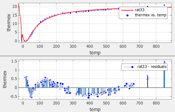 load hahn1; f = fit( temp, thermex, 'rat32') plot(f,temp,thermex)