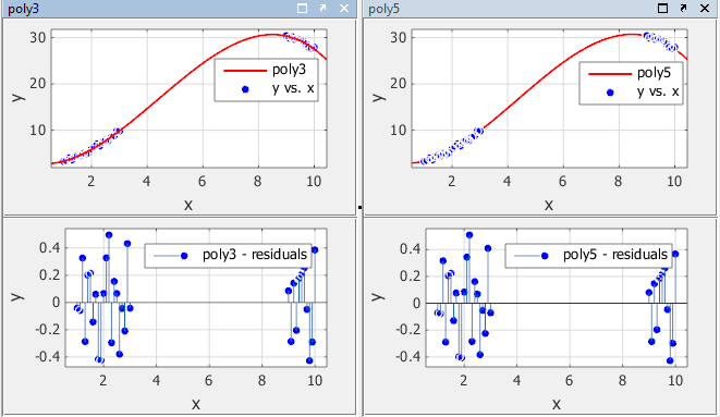 Приспособьте данные в приложении Curve Fitting с помощью кубического полинома и пятого полинома степени. Данные, подгонки и остаточные значения показывают ниже. Отобразите остаточные значения в приложении Curve Fitting путем выбора View> Residuals Plot.
