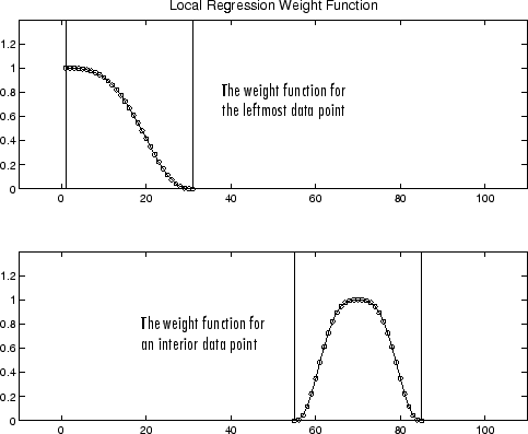 Если сглаженное вычисление включает то же количество соседних точек данных по обе стороны от сглаживавшей точки данных, функция веса симметрична. Однако, если количество соседних точек не симметрично о сглаживавшей точке данных, то функция веса не симметрична. Обратите внимание на то, что различающийся процесс сглаживания скользящего среднего значения, промежуток никогда не изменяется. Например, когда вы сглаживаете точку данных с наименьшим значением предиктора, форма функции веса является усеченной одной половиной, крайняя левая точка данных в промежутке имеет самый большой вес, и все соседние точки справа от сглаживавшего значения.