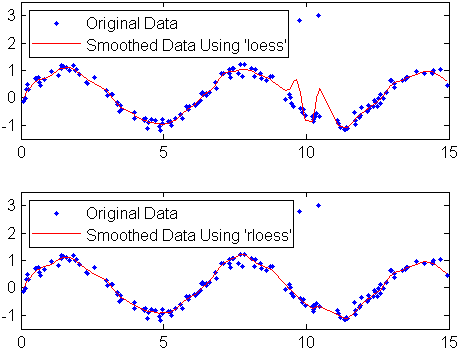 yy1 = smooth(x,y,0.1,'loess'); yy2 = smooth(x,y,0.1,'rloess');