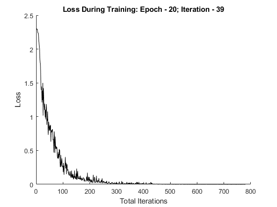 for epoch = 1:numEpochs % Shuffle data. idx = randperm(numel(YTrain)); XTrain = XTrain(:,:,:,idx); YTrain = YTrain(idx); for i = 1:numIterationsPerEpoch % Read mini-batch of data and convert the labels to dummy % variables. idx = (i-1)*miniBatchSize+1:i*miniBatchSize; X = XTrain(:,:,:,idx); Y = zeros(numClasses, miniBatchSize, 'single'); for c = 1:numClasses Y(c,YTrain(idx)==classes(c)) = 1; end % Convert mini-batch of data to a dlarray. dlX = dlarray(single(X),'SSCB'); % If training on a GPU, then convert data to a gpuArray. if (executionEnvironment == "auto" && canUseGPU) || executionEnvironment == "gpu" dlX = gpuArray(dlX); end % Evaluate the model gradients and loss using dlfeval and the % modelGradients helper function. [grad,loss] = dlfeval(@modelGradients,dlnet,dlX,Y); % Update the network parameters using the Adam optimizer. [dlnet,averageGrad,averageSqGrad] = adamupdate(dlnet,grad,averageGrad,averageSqGrad,iteration); % Display the training progress. if plots == "training-progress" addpoints(lineLossTrain,iteration,double(gather(extractdata(loss)))) title("Loss During Training: Epoch - " + epoch + "; Iteration - " + i) drawnow end % Increment the iteration counter. iteration = iteration + 1; end end