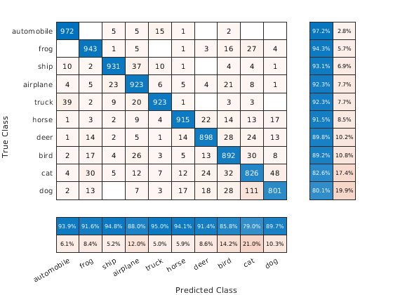 confusionchart( создает матричный график беспорядка от истины, маркирует trueLabels,predictedLabels)trueLabels и предсказанные метки predictedLabels и возвращает ConfusionMatrixChart объект. Строки матрицы беспорядка соответствуют истинному классу, и столбцы соответствуют предсказанному классу. Диагональные и недиагональные ячейки соответствуют правильно и неправильно классифицированные наблюдения, соответственно. Используйте cm изменить матричный график беспорядка после того, как это создается. Для списка свойств смотрите ConfusionMatrixChart Properties.