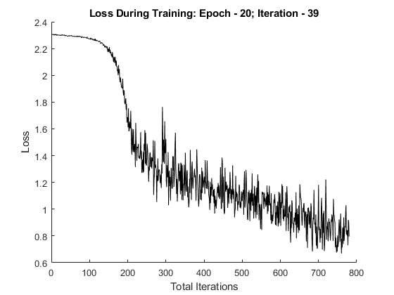 for epoch = 1:numEpochs % Shuffle data. idx = randperm(numel(YTrain)); XTrain = XTrain(:,:,:,idx); YTrain = YTrain(idx); for i = 1:numIterationsPerEpoch % Read mini-batch of data and convert the labels to dummy % variables. idx = (i-1)*miniBatchSize+1:i*miniBatchSize; X = XTrain(:,:,:,idx); Y = zeros(numClasses, miniBatchSize, 'single'); for c = 1:numClasses Y(c,YTrain(idx)==classes(c)) = 1; end % Convert mini-batch of data to dlarray. dlX = dlarray(single(X),'SSCB'); % If training on a GPU, then convert data to a gpuArray. if (executionEnvironment == "auto" && canUseGPU) || executionEnvironment == "gpu" dlX = gpuArray(dlX); end % Evaluate the model gradients and loss using dlfeval and the % modelGradients helper function. [grad,loss] = dlfeval(@modelGradients,dlnet,dlX,Y); % Update the network parameters using the SGD algorithm defined in the % sgdFunction helper function. dlnet = dlupdate(@sgdFunction,dlnet,grad); % Display the training progress. if plots == "training-progress" addpoints(lineLossTrain,iteration,double(gather(extractdata(loss)))) title("Loss During Training: Epoch - " + epoch + "; Iteration - " + i) drawnow iteration = iteration + 1; end end end