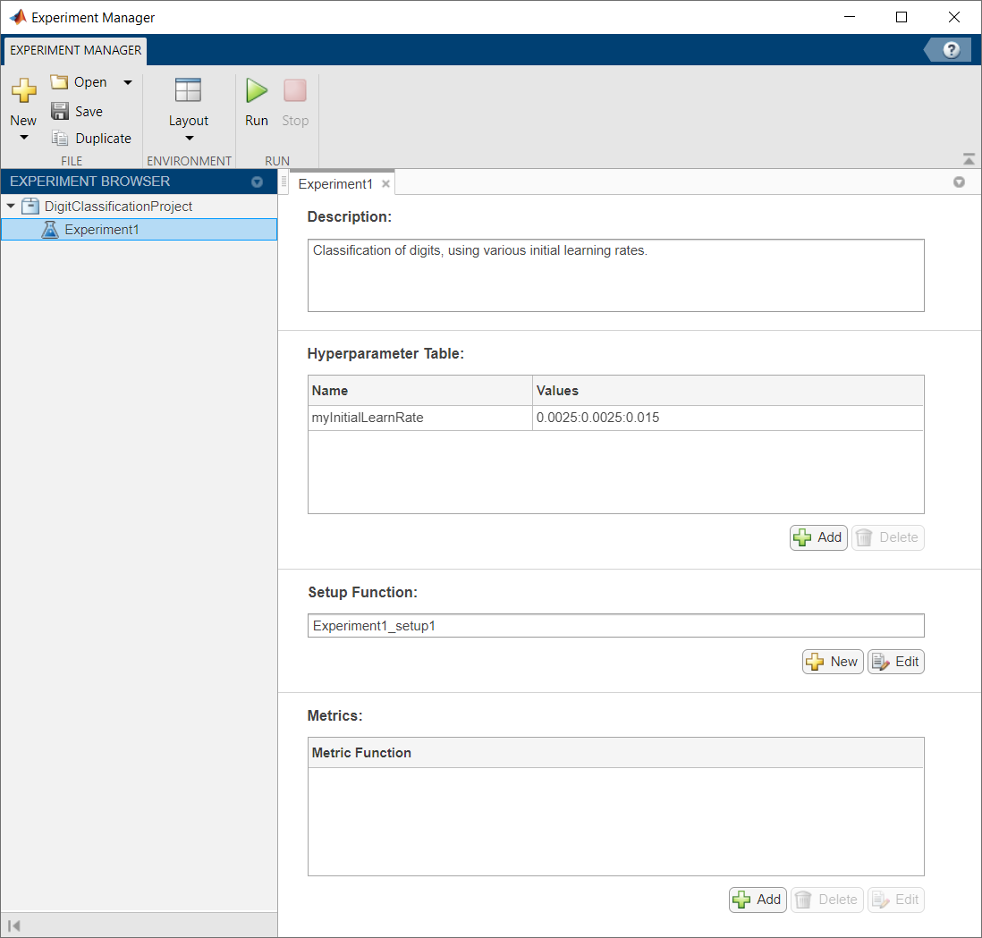 2. Нажмите New> Project и выберите местоположение и имя для нового проекта. Experiment Manager открывает новый эксперимент в проекте. Панель Эксперимента отображает описание, гипертаблицу параметров, функцию настройки и метрики, которые задают эксперимент.